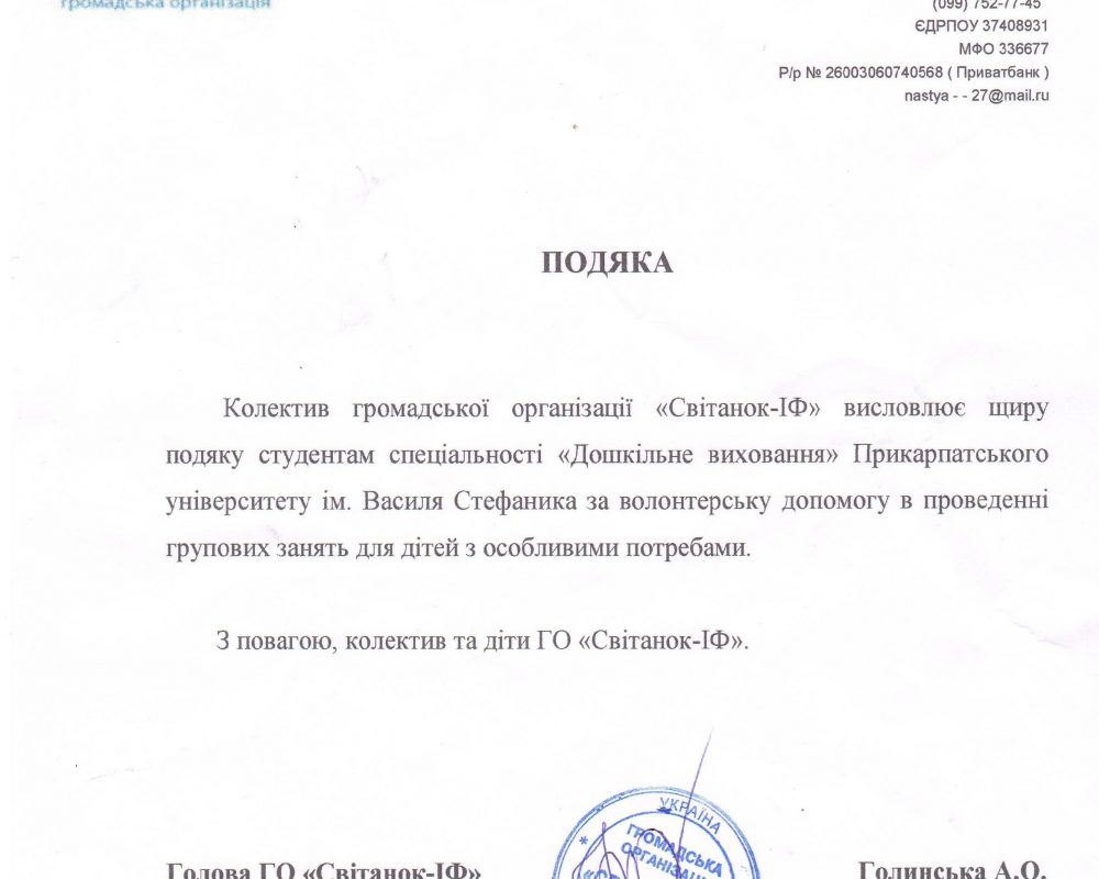 У березні-квітні 2018р. студенти ІІІ курсу спеціальності “Дошкільна освіта” (викладачі Кирста Н.Р., Чупахіна С.В.) стали учасниками (волонтерами) інтенсив-курсу, який було проведено на базі громадської організації “Світанок-ІФ”, що спеціалізується на роботі з дітьми з аутичним типом розвитку. Впродовж п’яти днів студенти активно залучалися до групових занять з поведінкової та мовної терапії, сомато-сенсорної інтеграції, занять з розвитку міжособистісних взаємовідносин, арт-терапії, музикотерапії, працювали в майстерні, організовували театралізовані дійства.