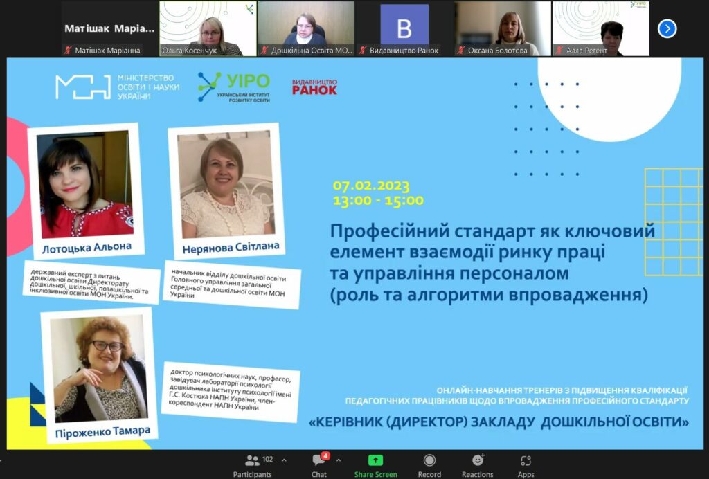 Упродовж лютого – березня 2023 року Міністерством освіти і науки України спільно з державною установою «Український інститут розвитку освіти» у партнерстві з видавництвом «Ранок» було проведено онлайн-навчання для підготовки тренерів з підвищення кваліфікації педагогічних працівників щодо впровадження професійного стандарту «Керівник (директор) закладу дошкільної освіти». До програми підготовки тренерів було залучено представників закладів вищої освіти, інститутів післядипломної педагогічної освіти, к