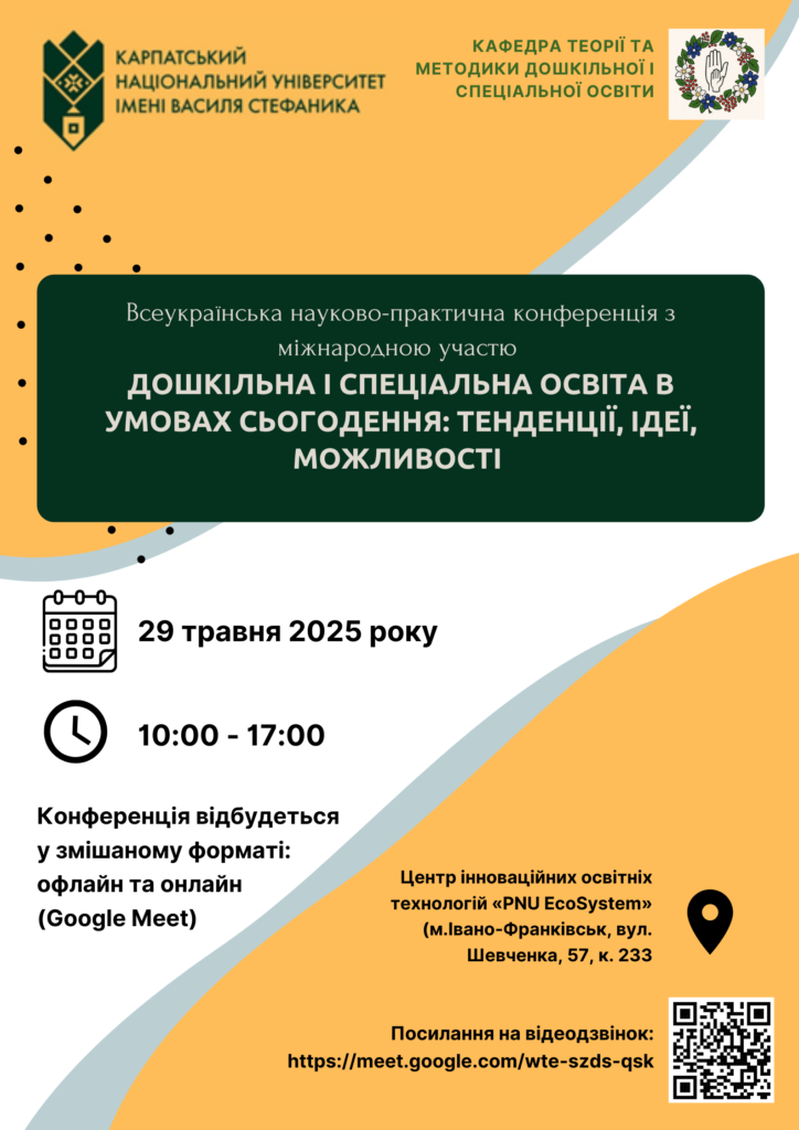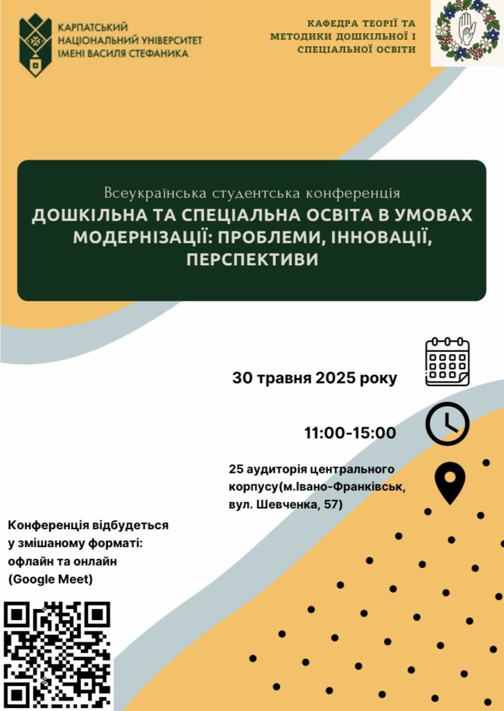 Шановні викладачі, здобувачі освіти, стейкхолдери! Запрошуємо Вас долучитися до Всеукраїнської студентської конференції «ДОШКІЛЬНА ТА СПЕЦІАЛЬНА ОСВІТА В УМОВАХ МОДЕРНІЗАЦІЇ: ПРОБЛЕМИ, ІННОВАЦІЇ, ПЕРСПЕКТИВИ» яка відбудеться 30 травня 2025 року в Прикарпатському національному університеті імені Василя Стефаника. Робота конференції планується в змішаному Читати далі