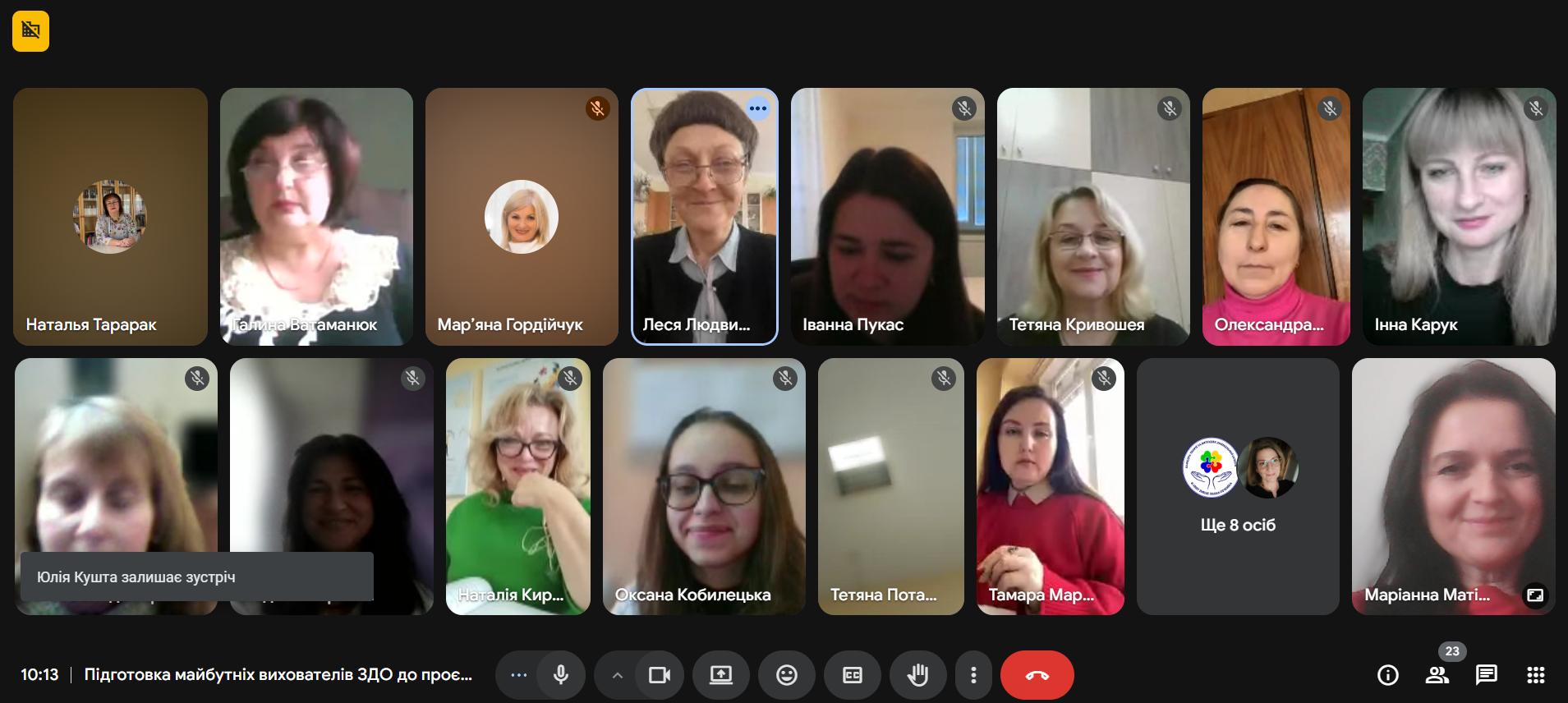 В онлайн-зустрічі взяли участь науково-педагогічні працівники кафедри та науковці з Вінницького державного педагогічного університету імені Михайла Коцюбинського, Кам’янець-Подільського національного університету імені Івана Огієнка, Національного університету «Чернігівський колегіум» імені Т. Г. Шевченка, Харківського національного педагогічного університету імені Г. С. Сковороди.