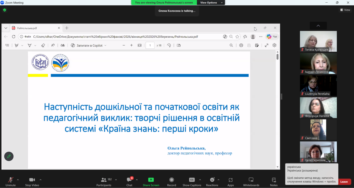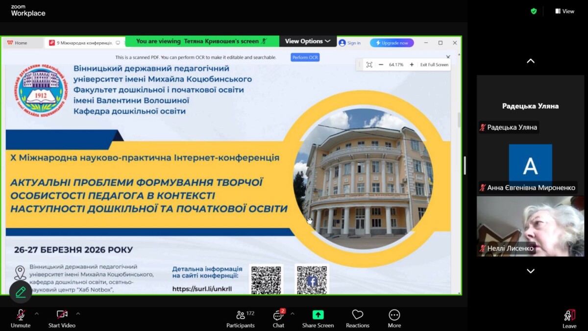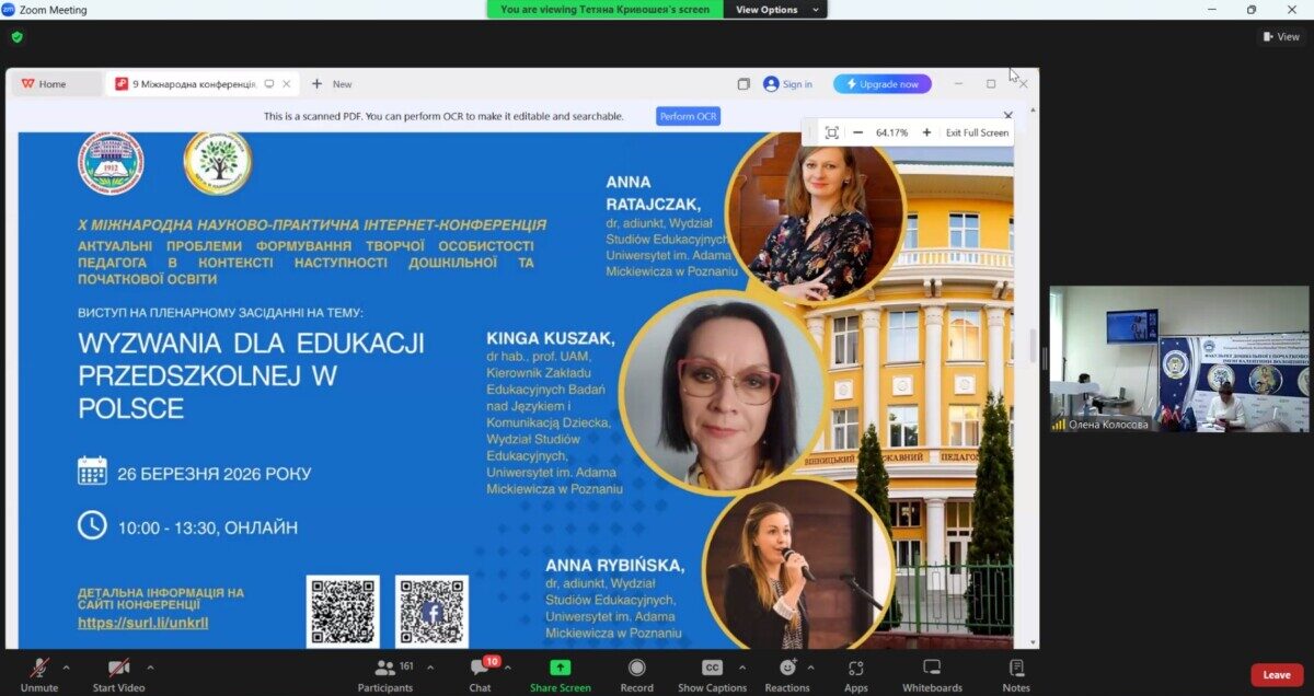 26 березня 2026 року викладачі кафедри теорії та методики дошкільної і спеціальної освіти Карпатського національного університету імені Василя Стефаника долучилися до роботи Х Міжнародної науково-практичної інтернет-конференції «Актуальні проблеми формування творчої особистості педагога в контексті наступності дошкільної та початкової освіти». З вітальним словом виступила кандидат педагогічних наук, професор, завідувач кафедри теорії та методики дошкільної і спеціальної освіти Людмила МАЦУК. Для нашої кафедри це не лише участь у науковому заході, а й важливий простір професійного осмислення сучасних освітніх викликів. У фокусі — творчість педагога як ключова умова розвитку дитини, забезпечення наступності між дошкільною та початковою освітою, психологічна безпека в умовах війни, інклюзія, екологічна свідомість.