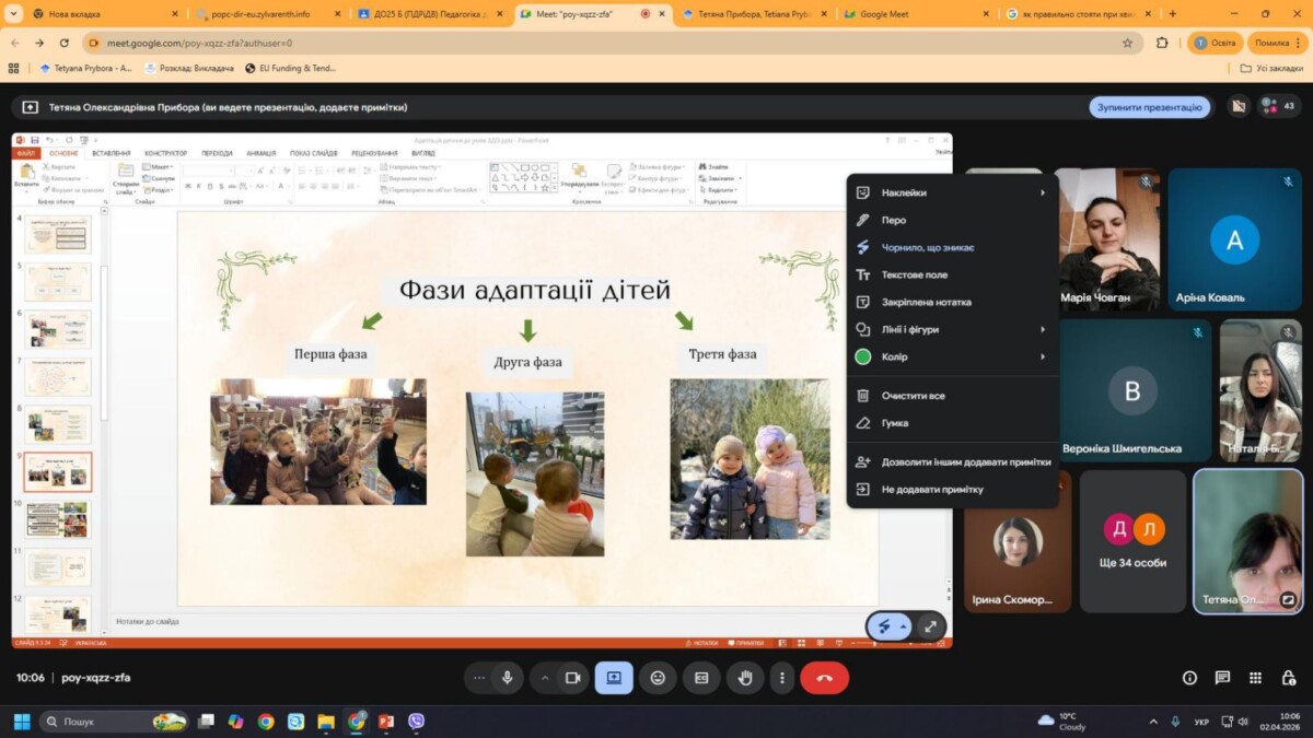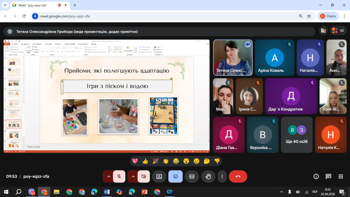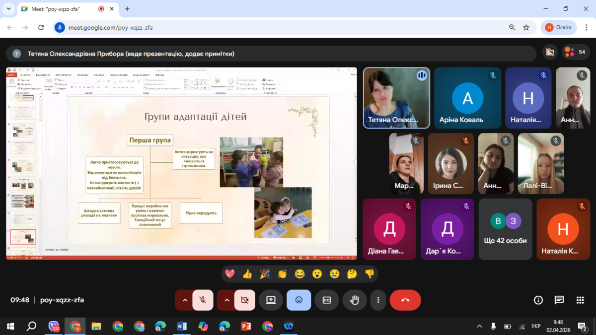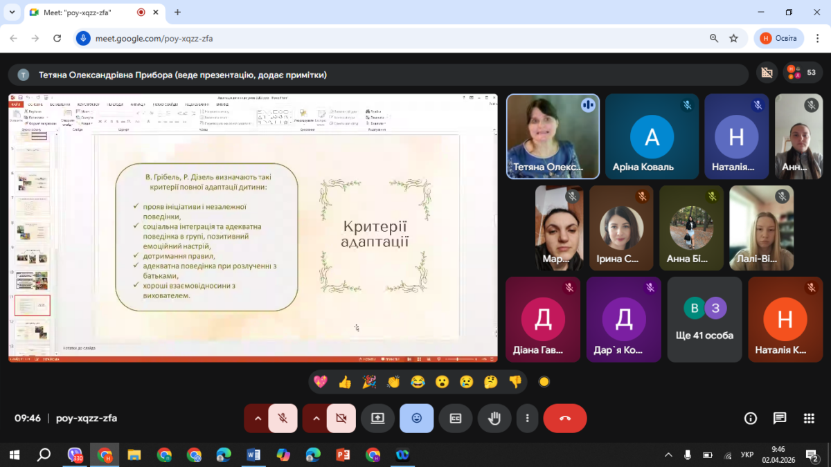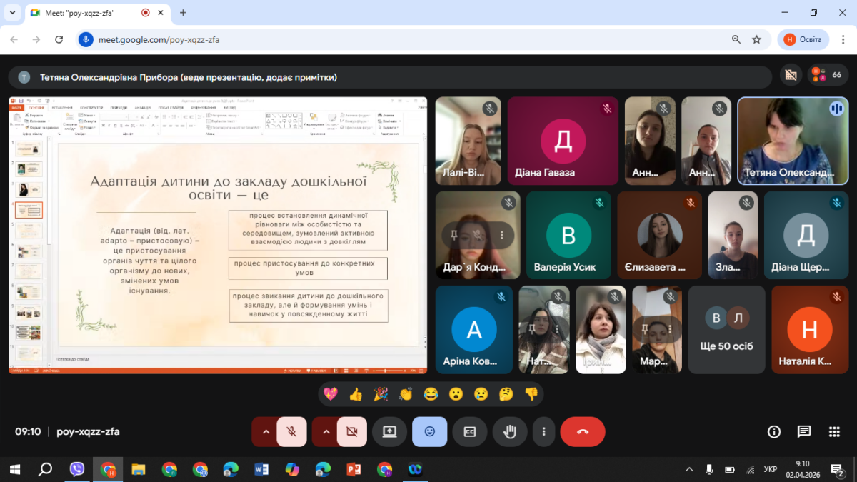 Значна увага під час лекції була приділена живому діалогу зі студентською аудиторією, що сприяло активізації рефлексії та осмисленню власного досвіду. Студенти наводили приклади з реального життя, пов’язані з труднощами адаптації дітей до умов закладу дошкільної освіти, що дозволило розглянути проблему на прикладі конкретних педагогічних ситуацій. Такий формат взаємодії забезпечив глибше розуміння індивідуальних відмінностей адаптаційних реакцій дітей і підкреслив значення гнучкості педагогічного підходу.